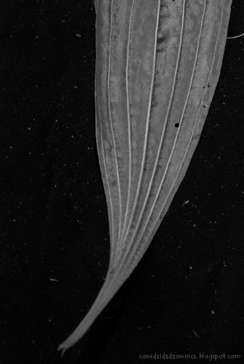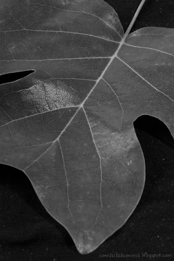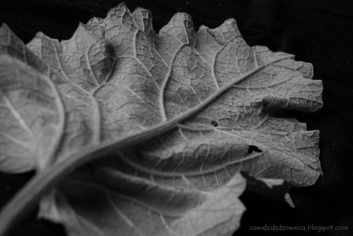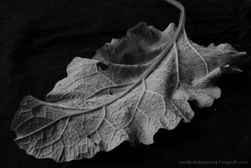 W dzisiejszej opowieści natkniemy się na kilka trudnych momentów. Pozwólcie, że się rozpiszę, by się z nimi rozprawić. Bądźcie zatem dzielni i miejmy to za sobą. Najogólniej rzecz ujmując chodzi o czwarte (i ostatnie z obowiązkowych) zadanie z kompozycji noszące tytuł "Liść" oraz około zadaniowe perypetie dżdżownicy. Tym razem należało zrobić 1-3 zdjęć liści. Zadanie wymagało skupienia uwagi na liniach i użycia ich jako (po pierwsze) elementów prowadzących oko po zdjęciu oraz (po drugie) elementów dynamicznych i emocjonalnych (np. spokojna energia przyjemności i harmonii, erotyczna energia zmysłowości, nerwowa energia dyskomfortu i zagrożenia). Jako nie dościgniony ideał B. S. wskazała nam liść kapusty Edwarda Westona. Dodatkowe zalecenia obejmowały wybieranie dużych liści oraz wpasowywanie ich w ciasne kadry. Na tym etapie koniecznie trzeba wspomnieć o tym, że B. S. pozwoliła nam wszystkie zadania z kompozycji realizować za pomocą cyfry. Wprawdzie na pierwszym roku studium obowiązuje nas wyłącznie fotografia analogowa, ale na te zadania mieliśmy stosunkowo mało czasu i tylko z tego względu B. S. uczyniła dla nas wyjątek. Ponieważ osobiście nadal technicznie nie domagam, z radością sięgnęłam po cyfrę. Wracając jednak do zadania numer cztery... W liściastej kwestii z pomocą oraz jednocześnie z kłodą pod nogi przyszedł mi dom moich rodziców, wybudowany kilka lat temu w pobliżu Łodzi. Wybrałam się tam w połowie października, by zarówno w ogrodzie jak i przy okolicznych polnych dróżkach znaleźć bogactwo 'kandydatów' do zdjęć. Spacerowałam, nie strudzenie przebierałam, wybierałam i ostatecznie przytaszczyłam do domu dwie siaty pełne liści. W międzyczasie słońce, które wpadając przez kuchenne okna miało stanowić oświetlenie, zaszło sobie w najlepsze. Z niemałą nadzieją, że liście dożyją, odłożyłam fotografowanie na następny dzień. Od rana miałam sporo do zrobienia toteż budzik na poddaszu rozdzwonił się o 6:45. Przeważnie o tej porze oczy otwierają mi się w zaniedbywalnie małym stopniu. Nawet śmiejemy się z Połówą, że gdy budzi się mnie zbyt wcześnie, to nie mam oczu. Zatem na jego pytania "Czy Słonko wstaje?" odpowiadam pytaniem "A czy Słonko ma oczy?". Jak ma, to wstaje. Proste - logiczne. W tamten wtorek niestety nie miałam oczu. Poranną toaletę postanowiłam rozpocząć od umycia włosów. W tym celu należało zejść na parter, aby pozyskać suszarkę z łazienki rodziców. No to otwieram drzwi na klatkę schodową. Zapalam na niej światło. Robię pierwszy krok na pierwszy stopień. Potem drugi na drugi... I tu czuję, że dzieje się coś bardzo bardzo niedobrego. Oba łapcie na raz podstępnie ześliznęły się z drugiego stopnia... Widzę jak podcięte w ten sposób nogi znajdują się na tle ściany przechodzącej szybko w skośny sufit poddasza... Można by użyć poetyckiej przenośni, iż szybko ujrzałam swoje nogi na tle nieba. To naprawdę fascynujące, ile człowiek ma wniosków od chwili utraty przyczepności do momentu runięcia na schody. Uderzam plecami i 'ogonem'. I to z hukiem! Aż się tynk z podstopnic osypał. Wołam o pomoc. Bezruch. Gorączkowo analizuję sytuację. Mama wzywa karetkę. Klnę. Mam tłuste włosy i pewnie nieprędko je umyję. I liście! Dwie torby pieczołowicie wyselekcjonowanych egzemplarzy zwiędną w najlepsze, bo los postanowił mnie dziś doświadczyć! Dżdżownice są twarde. Karetka zabiera mnie do szpitala. Kości całe, narządy bez zmian. Prawa noga ma zachowane czucie, ale w lewej jest ono słabe. To zbity na kwaśne jabłko nerw kulszowy (wskazujący na twarde lądowanie na lewym pośladku). Lekarz chce mnie zatrzymać w szpitalu. Ja chcę moje liście. Lekarz wypisuje recepty i ostrzega, że jeszcze tylko dziś będę się czuła znośnie, potem obrzęk, ból, usztywnienie uniemożliwią mi normalne funkcjonowanie. Mama zabiera mnie do domu. Do liści. Dżdżownice są twarde. Jest południe. Mama sprawnie przygotowuje stół, czarną koszulkę udającą tło, podaje mi kolejne liście. Początkowo brak mi pomysłu. Mama 'cuduje' z liśćmi, żeby jakoś wykrzesać z nich energię przyjemności czy zagrożenia. Przykładowo wymachuje mi przed nosem liściem babki lancetowatej wmawiając mi, że to skorpion i powinnam się czuć zagrożona ;-) Powiedzcie sami, jak jej nie kochać? Uwijam się nad liśćmi dwie godziny. Szybki obiad i trudna decyzja. Wsiadam za kierownicę i póki mogę jadę do Warszawy. Ponieważ jestem w stanie stać i siedzieć jadę wieczorem na zajęcia do ciemni. To był trudny wtorek. A w środę już nie wstałam z łóżka. Cały dzień minął mi na traceniu przytomności. Co godzinę, na godzinę. Mniej więcej. Nie wiedziałam co się ze mną dzieje. Byłam przerażona. Ledwo dałam radę zadzwonić po pracującą Połówę. Okazało się, że przepisany mi w szpitalu lek przeciwbólowy zawiera opiaty, a ja padłam ofiara najczęstszych skutków ubocznych. Odstawiłam go natychmiast i następnego dnia odzyskałam przytomność. Niestety łykanie proszków przeciwbólowych dostępnych bez recepty okazało się bezcelowe, a ja nie znam się na warszawskich przychodniach... Pozostało mi dzielnie znosić cały ten kram. Dżdżownice są twarde. W pierwszy weekend po upadku pojechałam na organizowany przez studium dwudniowy plener fotograficzny. Dżdżownice są twarde. Po miesiącu czułam się już prawie normalnie. Tylko czasem lewy nerw kulszowy dokazuje, bo tak ma. Na wspomnianym plenerze pokazałam B. S. kilka zdjęć liści. Po ich rozłożeniu na stole B. S. powiedziała, że wyglądam jej na specjalistkę od fotografowania liści. To było miłe, bo naprawdę się przyłożyłam. Usłyszałam też, że trzy z nich tworzą świetny tryptyk - w sam raz na czerwcową wystawę. Nie wierzyłam własnym uszom! Takie wyróżnienie! Siła charakteru zaprocentowała! (Doro